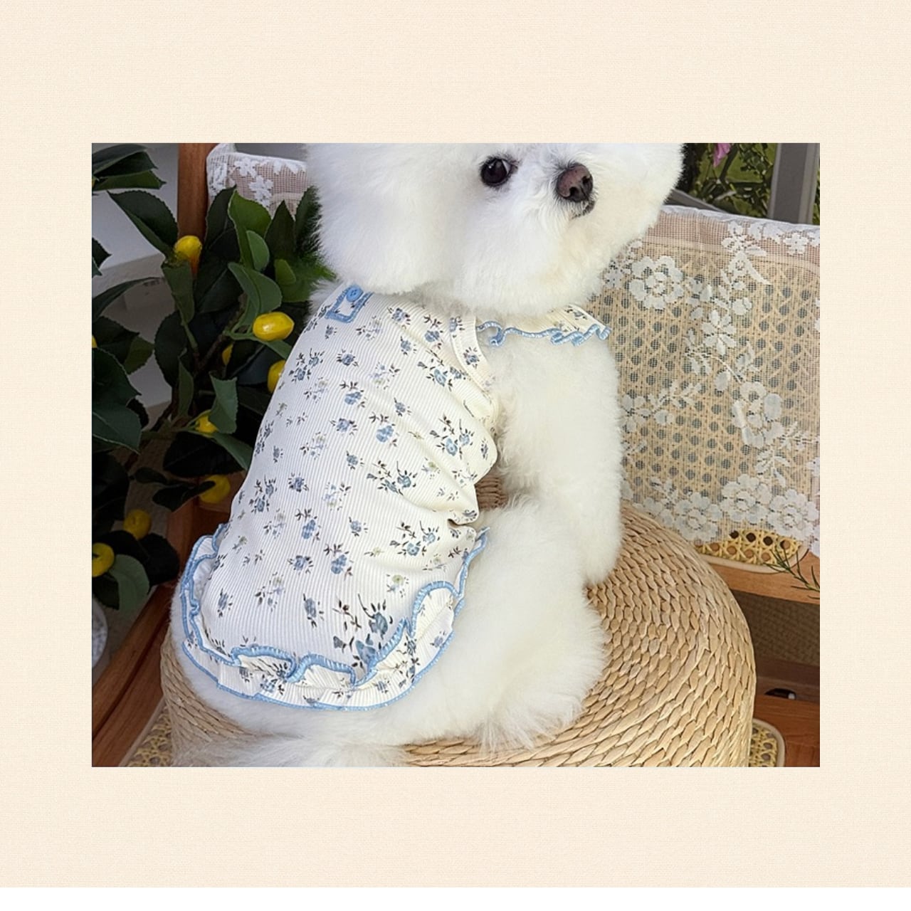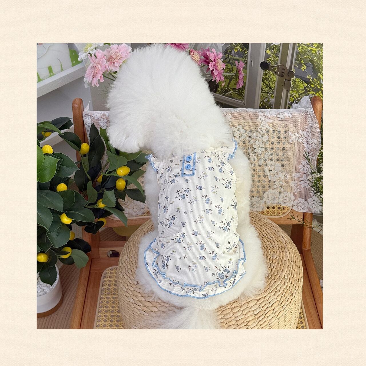 華やかな花柄が印象的なカジュアルスタイルは、愛犬を一層引き立てます。お散歩やおうちでのくつろぎタイムに最適なアイテムです!